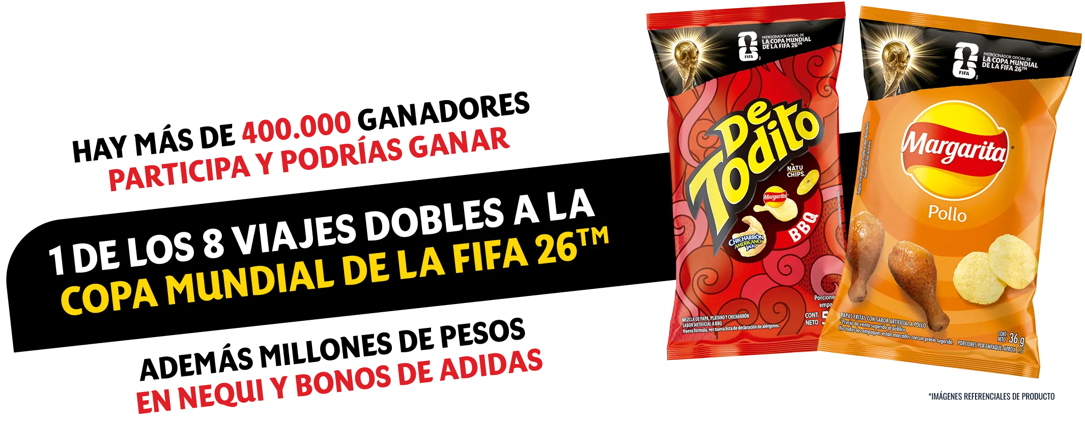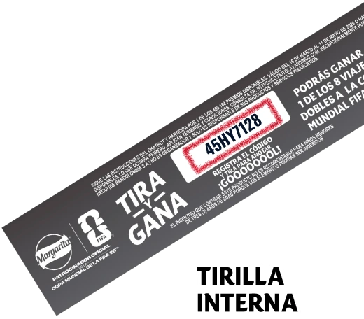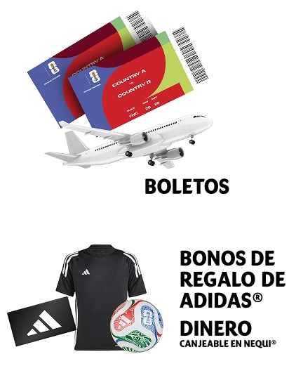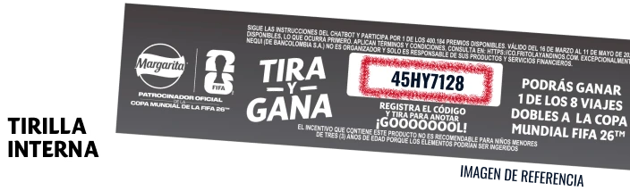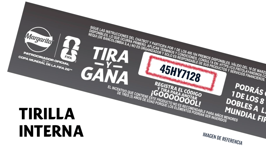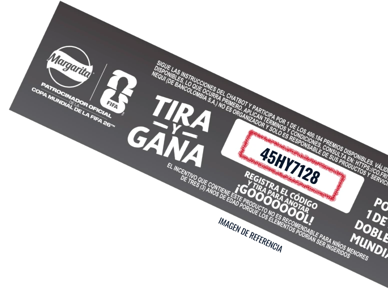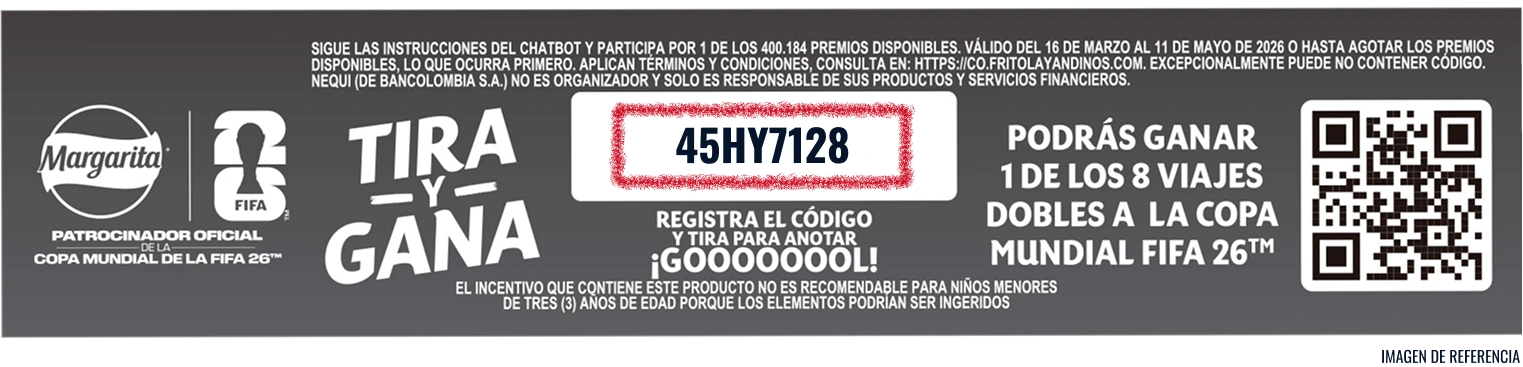 Sigue las instrucciones del ChatBot y participa por 1 de los 400.184 premios disponibles. Válido del 16 de marzo al 11 de mayo de 2026 o hasta agotar los premios disponibles, lo que ocurra primero. Aplican términos y condiciones, consulta en https://co.fritolayandinos.com/. No todos los empaques tienen tirilla, y excepcionalmente puede no contener código. Nequi (de Bancolombia S.A.) no es organizador y sólo es responsable de sus productos y servicios financieros.” “Sé de los primeros en registrar el código de la tirilla interna para anotar un penalti en el ChatBot. Podrás ganar $5.000 en Nequi, y si eres el que más tira penalties en el día, podrás ganar un bono de regalo de Adidas®” “Si eres el que más penaltis anota en la semana, podrás ganar un viaje doble para ver un partido de la Copa Mundial de la FIFA 26™” “El incentivo que contiene este producto no es recomendable para niños menores de tres (3) años de edad porque los elementos podrían ser ingeridos